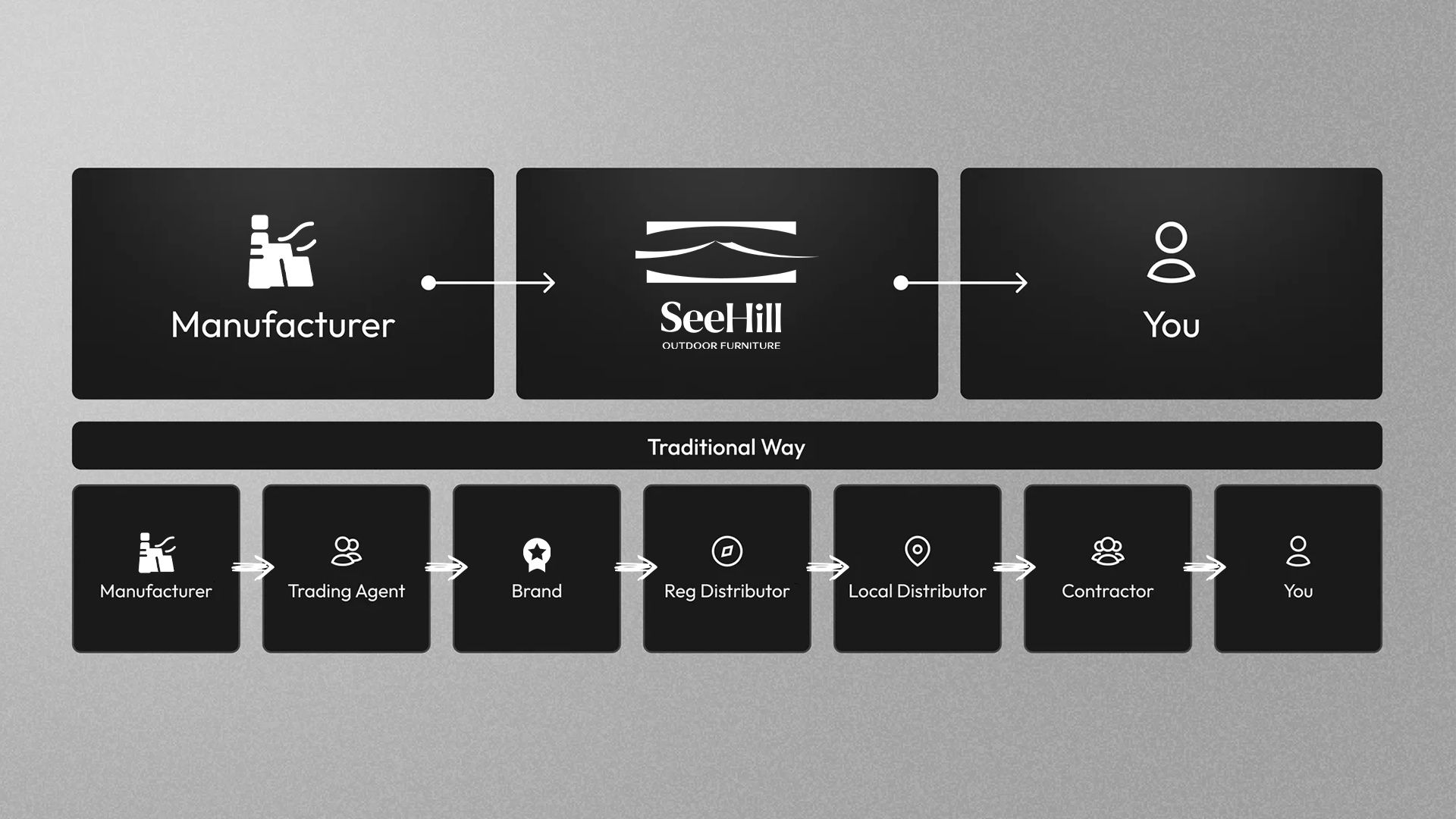 Traditional chains pass your furniture through 6+ intermediaries, slowing communication and inflating costs. The SEEHILL Way connects our factory directly to you, cutting layers and delivering outdoor furniture with better value, faster response, and seamless real-world performance.