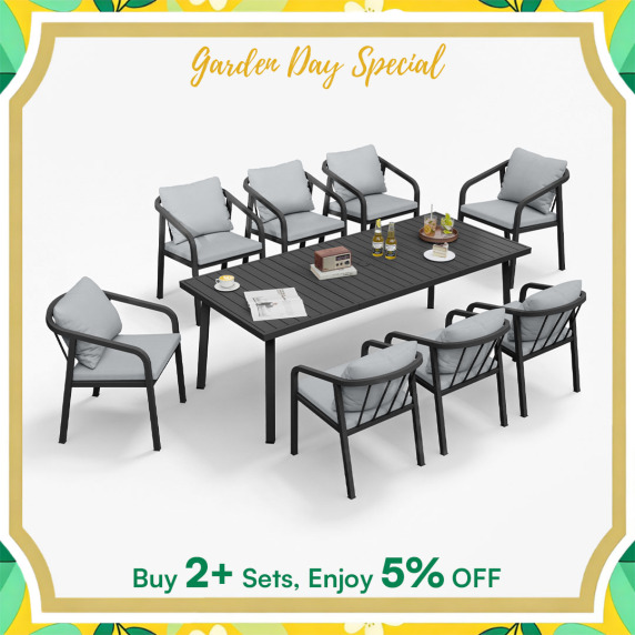Material choice influences both usability and durability. Aluminum frames are ideal for patio dining sets because they resist rust and corrosion. A rectangle patio table umbrella hole for 8 paired with aluminum chairs remains stable in outdoor conditions. Lightweight construction allows easy repositioning. Users can adjust layouts based on sunlight or guest needs. Aluminum also requires minimal maintenance compared to steel or wood. This makes it suitable for long-term outdoor placement. Durable yet portable furniture improves flexibility in smaller patios where layout changes may be frequent.