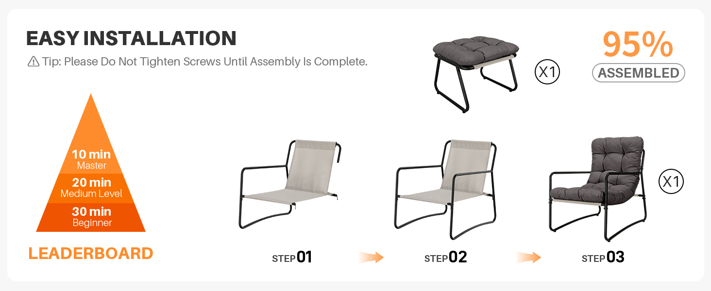 Reinforced powder-coated metal frames and non-slip foot pads keep chair and ottoman steady for safe use on patios, decks, balconies, or indoors.