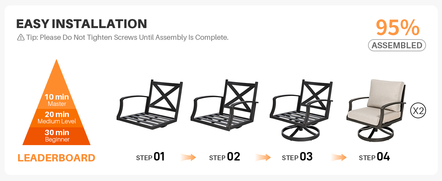 Constructed from reinforced recyclable aluminum frame, the chairs resist rust and corrosion from sun, rain or outdoor exposure, with exceptional strength and stability. Each swivel armchair supports up to 300 lbs, providing dependable and eco-conscious outdoor seating.