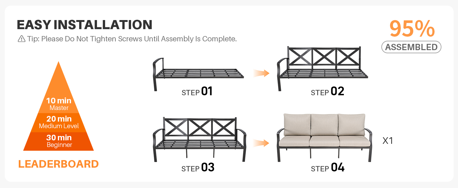 A spacious centerpiece for shared relaxation. Perfect for morning coffee, weekend gatherings, or sunset moments with family. Its robust, rust-proof frame ensures stability, while low-maintenance cushions stay fresh. The elegant X-back design blends style with durability. Easy to assemble, it anchors patios, decks, and backyards with refined comfort.