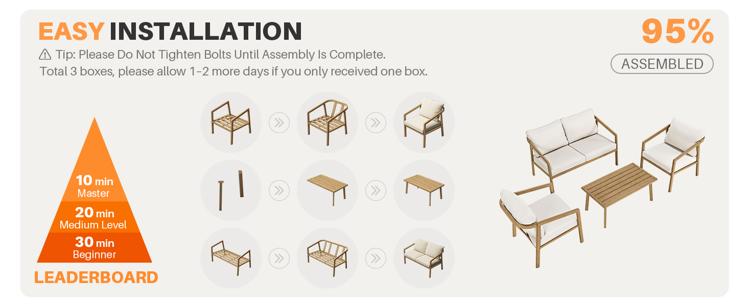 Wraparound seating for full-body support; reinforced rustproof aluminum frames, loveseat 600lbs, 300lbs per chair, coffee table 200lbs, recyclable and durable.