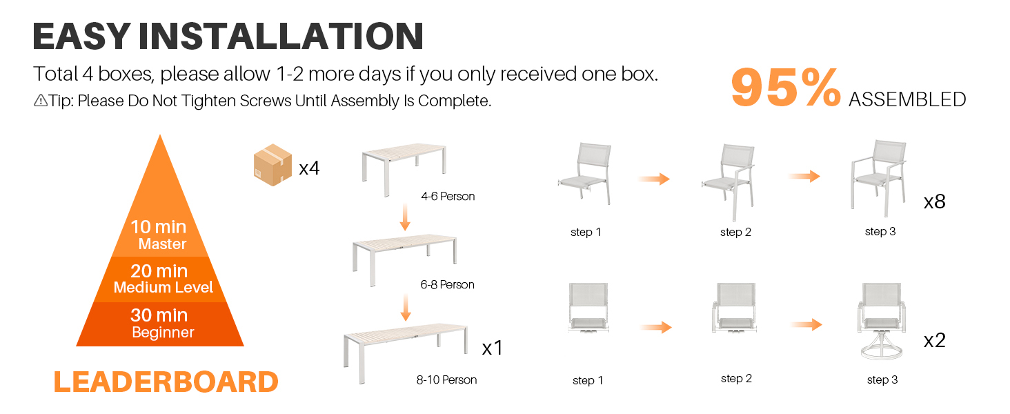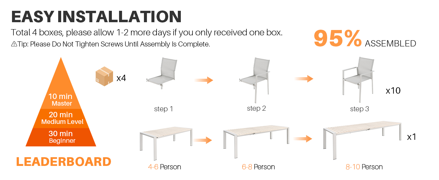 Full aluminum frame ensures rust and corrosion resistance, delivering reliable load-bearing capacity and year-round outdoor durability. Chairs are stackable for space-saving storage when not in use. The slatted tabletop enables quick water drainage, and adjustable leveling feet keep the table stable on uneven surfaces.