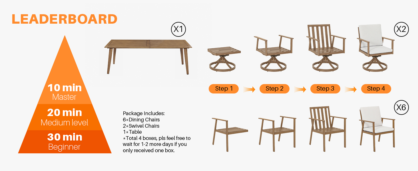 Expert hand-brushed painting creates a realistic natural wood texture, paired with a rust-proof, UV-resistant aluminum frame for all-weather durability. The set includes 2x360° swivel chairs (full rotation) and 6 ergonomic chairs (4 with back-and-forth motion), blending flexible interaction and relaxed comfort for diverse gatherings.