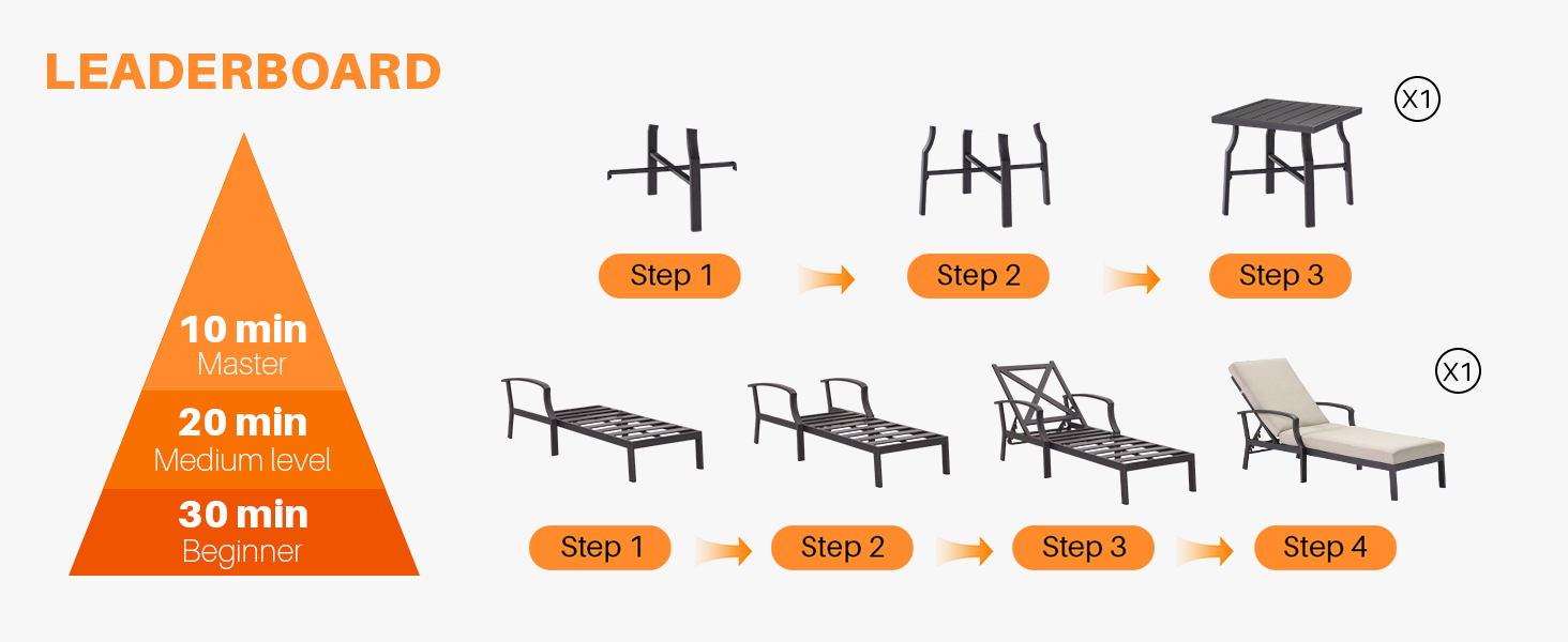 Lounge chair reclines from upright to fully flat for versatile relaxation; X-frame side table with solid stability, fits uneven terrain for daily use.
